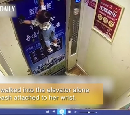 Uma cena dramática foi registrada na semana passada num prédio em Huangshi (China). Uma menina de 2 anos, que estava com uma guia de segurança amarrada ao punho direito, ficou presa num elevador, sem o seu acompanhante. As informações são do Extra.
