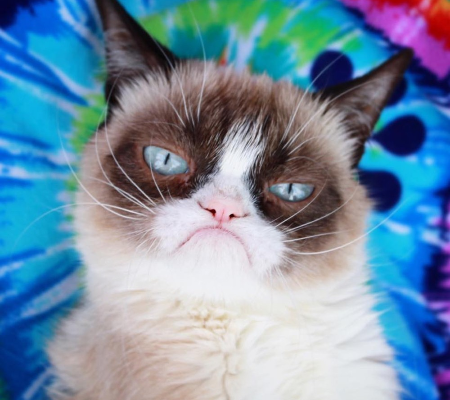 Grumpy Cat, que significa "gata rabugenta", é o apelido com o qual a gata ficou conhecida – seu nome real era Tardar Sauce. Ela ganhou fama na internet depois que fotos passaram a ser divulgadas em 2012. Rapidamente virou meme.