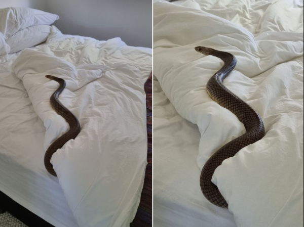 Uma moradora de Queensland, na Austrália, passou por um susto enorme ao trocar os lençóis da cama e encontrar uma cobra de 1,83 metro de comprimento. O animal foi resgatado pelo centro de Relocação de Cobras e Répteis do profissional Zachery Richards.