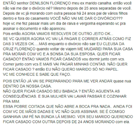 Em um texto postado na rede social, a mulher expôs o marido, Denilson. Segundo ela, os dois não vivem juntos há 25 anos e ele está com outra pessoa há 24. No entanto, ele parece se recusar a assinar o documento que põe fim ao casamento dos dois e já deixou de ir a quatro reuniões marcadas para resolver a situação.