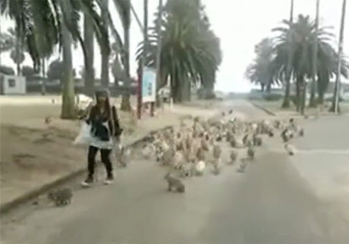 Em um vídeo gravado no Japão, uma jovem foi flagrada enquanto era perseguida por um ?exército? de coelhos, e corria carregando o que parecisa ser um saco de ração para os animais.
