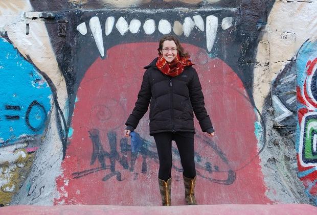 Rachael Pecore-Valdez parece ser "engolida" por um grafite com o desenho de lobo em um parque de skate em Reykjavik, na Islândia (Foto: Jaimes Valdez/AP)