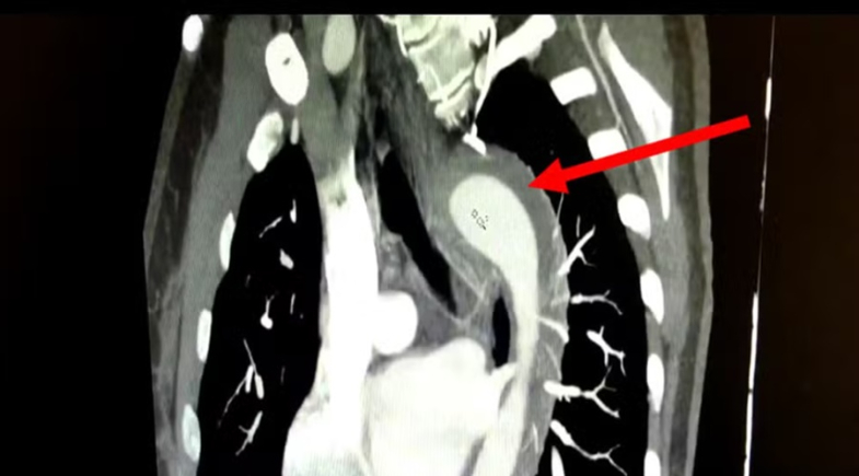 Exames de imagem confirmaram a presença de um hematoma intramural na aorta, um tipo de sangramento na parede do maior vaso sanguíneo do corpo, considerado uma Síndrome Aórtica Aguda (SAA).