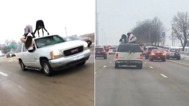 Quem passou na última segunda-feira (14) pela Interestadual 64, na altura de St. Louis (Missouri, EUA), deparou-se com uma surpresa - perigosa - na movimentada rodovia. Duas mulheres subiram no teto de uma SUV em movimento e começaram a fazer o twerking (rebolado provocativo que ficou famoso com a cantora Miley Cyrus). Uma outra mulher filmava a performance pela janela do banco do carona.