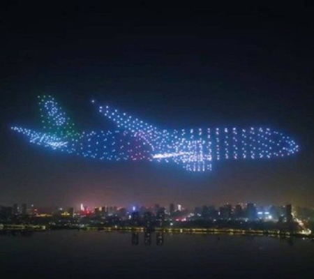 Um festival da indústria aeronáutica em Nanchang (Jiangxi, China) teve um desfecho apoteótico na noite do último sábado (16): 800 drones se juntaram para formar um "versão fantasma" de um avião comercial chinês C909 no céu da cidade. Com informações do Extra.