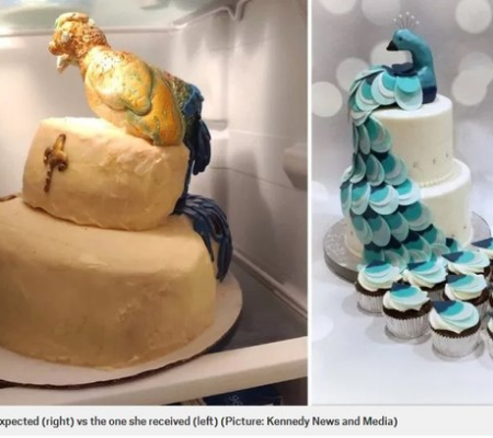 Segundo ela, cerca de cinco minutos depois de o confeiteiro ir embora, um dos pássaros equilibrados sem sustentação em cima do bolo tombou, tornando tudo ainda pior. Ela também percebeu que apesar de ter exigido uma cobertura de fondant, o doce era feito com creme de manteiga.