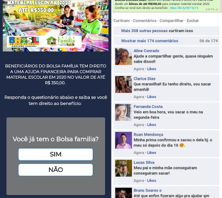 Em comunicado, a Secretaria Especial de Desenvolvimento Social informou que a informação é falsa. O ataque é direcionado a beneficiários do programa social e se aproveita do período de volta às aulas de 2020 para prometer um vale de R$ 350. "BOLSA ESCOLA 2020: Quem tem Bolsa Família o Governo Federal está dando um bônus de até R$350,00 para comprar material escolar 2020. Confira se você tem direito ao benefício", diz a mensagem que circula pelas redes.