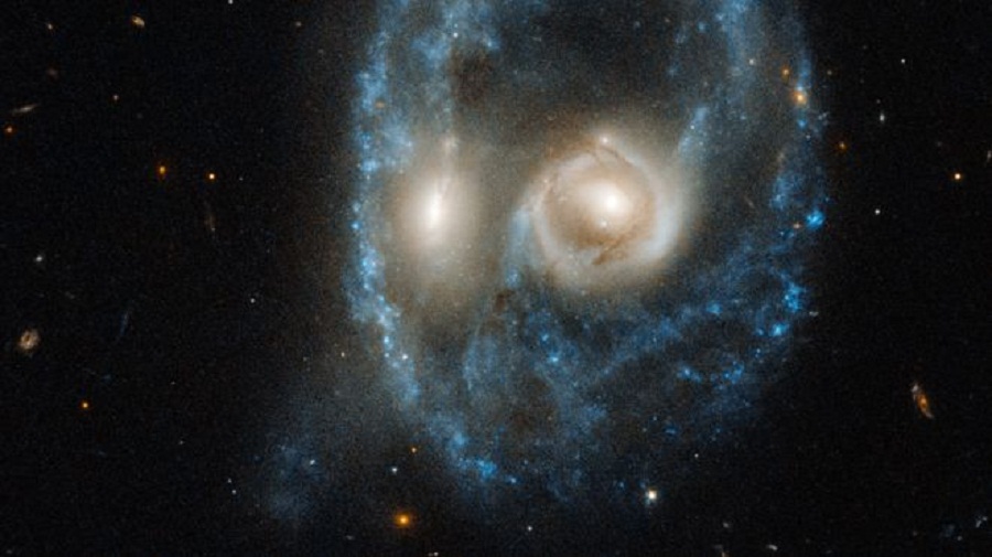 Os "olhos" do "rosto fantasmagórico" são o núcleo de cada galáxia. Anéis de estrelas azuis jovens e discos de gás e poeira das galáxias dão forma ao rosto, nariz e boca do "espectro".