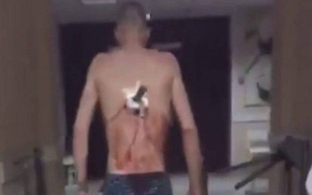 Uma enfermeira de um hospital em Kazan (Rússia) flagrou o momento em que um paciente, usando apenas cueca samba-canção, tentou deixar o local mesmo tendo um machado cravado nas costas.