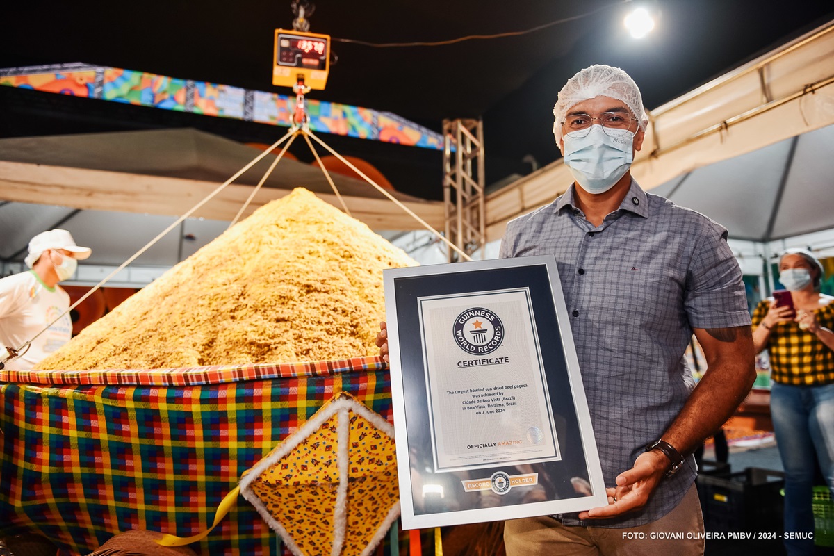 Recorde Mundial: A maior paçoca de carne seca do mundo é de Roraima e virou símbolo do arraial Boa Vista Junina, sendo reconhecida pelo Guinness Book, o Livro dos Recordes, oficialmente. O prato que é tradicionalmente uma paixão de diversos roraimenses quebrou o seu próprio recorde, chegando a pesar 1.356 kg de carne seca e farinha amarela. Oficialmente, a pesagem começou com 40 minutos de atraso, por volta das 19h40, fazendo parte de um dos requisitos do Guinness Book.