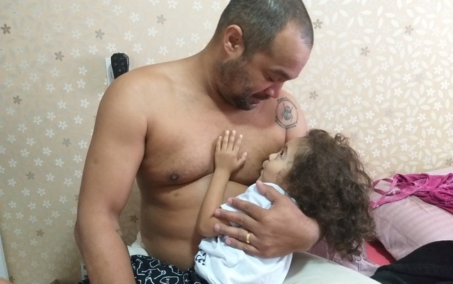 Quem protagoniza a foto da " amamentação " é Paulo Fregonezi, de 41 anos, e a filha Celina, de dois anos. O clique foi feito em uma manhã pela mãe, Marcela, de 35 anos. Em entrevista ao Deles , a mãe conta que a filha está em um processo de desmame natural e há algum tempo já não pede o peito de Marcela. No entanto, um dia, ela acordou e pediu o peito do pai, que a menina chama de “tati”.