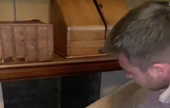 A passagem foi descoberta após observar fotos antigas da propriedade - que é de sua família há 30 anos - quando observou que uma porta na biblioteca da casa do século XVI não podia mais ser vista. Ele conta que retirou os livros das prateleiras, removeu os parafusos do painel de madeira e ao levantá-lo, achou uma sala escura atrás da lareira. Mas a sala estava vazia.