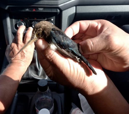 O acidente aconteceu no sábado (24). O pássaro da espécie ariramba-preta - que se assemelha a um beija-flor devido ao tamanho do bico - não resistiu ao impacto.