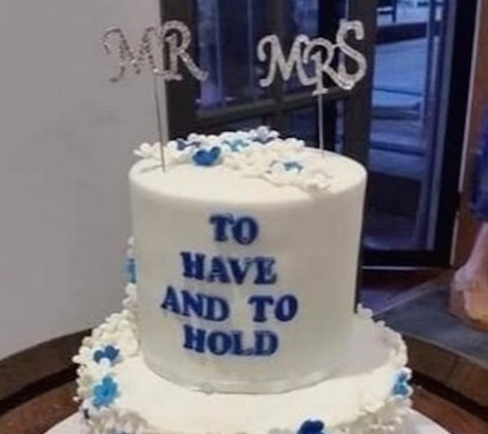 A decoração "particular" de um bolo de casamento chamou atenção da internet. Publicado em um grupo específico sobre o assunto no Facebook, o bolo não chama atenção no primeiro momento: um trabalho de confeitaria simples, com flores em branco e azul faz referência aos noivos no topo, além da frase "To have and to hold", algo como "ter e segurar”, em português. As informações são do IG.