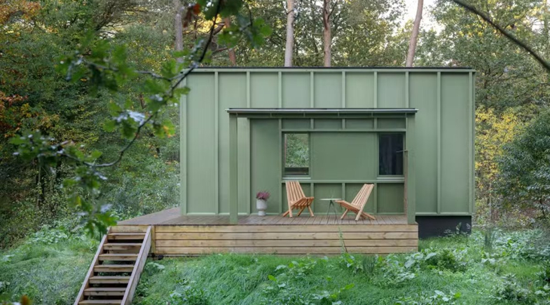 O revestimento externo em tom de verde foi adotado para aproximar visualmente a construção da vegetação ao redor. A proposta combina soluções compactas de moradia com foco em funcionalidade e sustentabilidade. (Com informações da Casa Vogue/Globo)