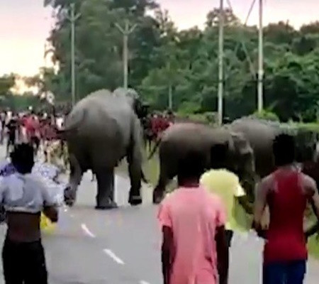 As imagens chocantes foram registradas no nordeste da Índia, no estado de Assam. Elefantes em busca de comida passaram por uma estrada e interromperam o fluxo de trânsito, ocupado principalmente por agricultores de uma plantação de chá.