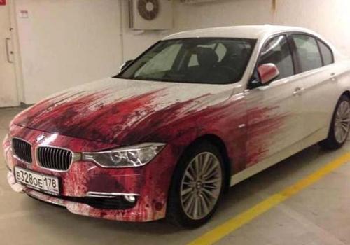 A imagem de um carro de luxo na Rússia com uma pintura curiosa tem sido bastante compartilhada pela web, mostrando desenhos que simulam uma grande mancha de sangue no para-choque, como se o veículo tivesse atingido alguém.