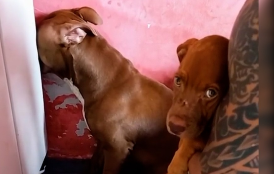 No vídeo, o cachorro se encosta na parede e 'vira a cara' para o tutor, Antônio João, porque, aparentemente, não teria gostado dele ter dado mais atenção a outra pitbull que chegou há apenas duas semanas na família, a Safira.