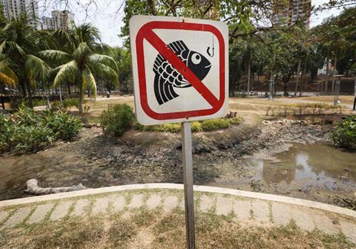 Placa de proibido pescar foi vista diante de viveiro de peixes seco em parque em Cingapura. Em fevereiro, país viveu mês mais seco desde 1869.