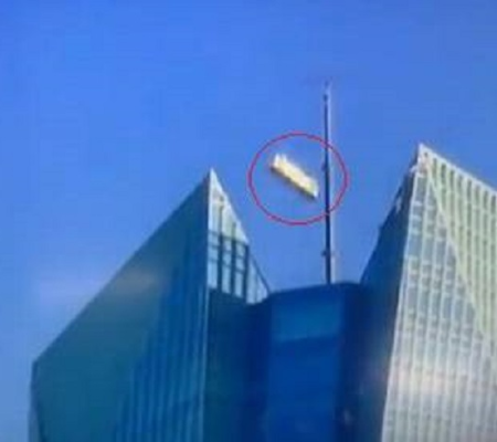 A plataforma foi jogada de um lado para o outro, em movimentos pendulares. Os faxineiros estavam quase no topo da torre, concluída em 2012, que tem 227 metros de altura. Eles tiveram que se agarrar às laterais do equipamento para não cair.