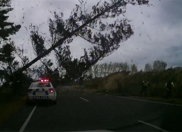 Na Ilha Norte, na Nova Zelândia, a câmera instalada em um veículo flagrou o momento em que policiais escapam por pouco de ser atingidos por uma árvore, enquanto retiravam parte de outra árvore que estava bloqueando a via.