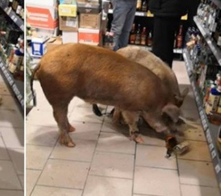 Porcos invadem supermercado e surpreendem ao beberem conhaque