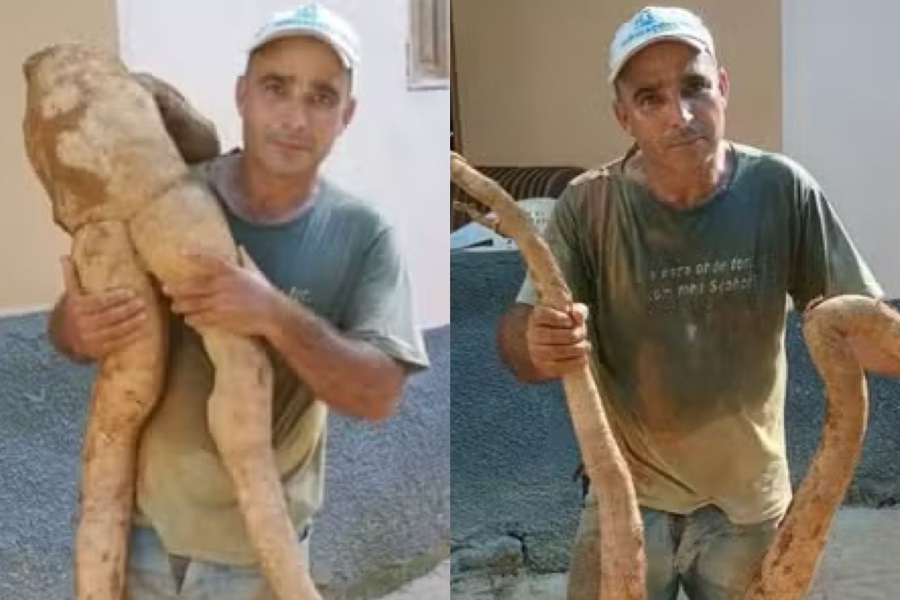 Roberto de Souza Teixeira achou o tubérculo tão curioso que tirou uma foto e postou nas redes sociais, o que gerou vários comentários, como "Parece que está abraçando uma mulher" e "Tirou um manequim da terra".