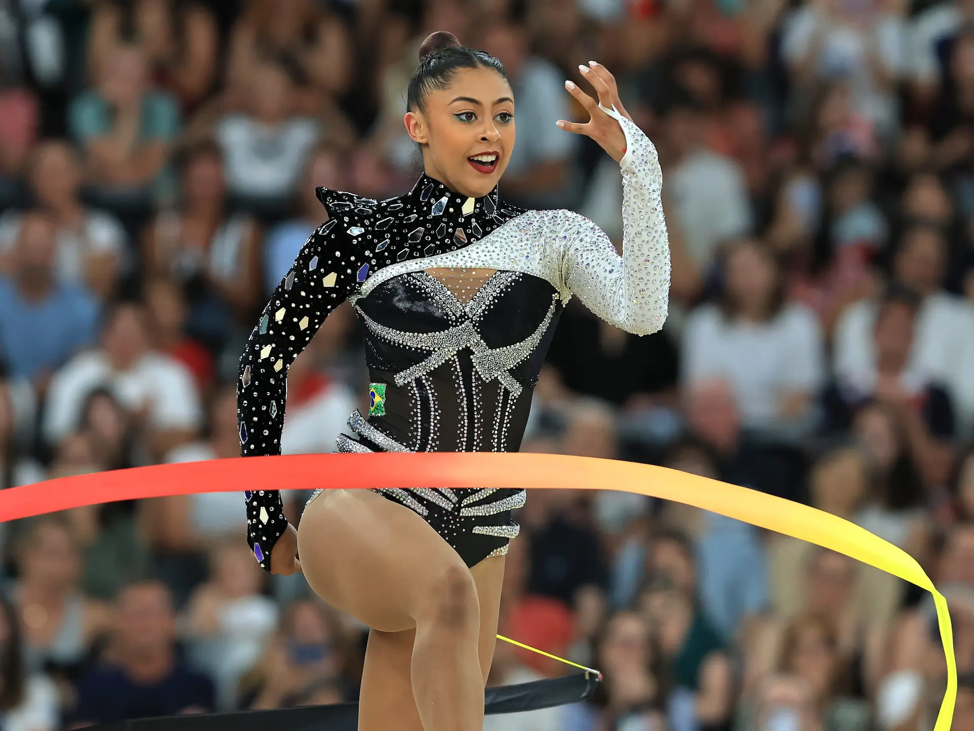 Paris (AFP) - Brasileira Barbara Domingos performa na final da ginástica rítmica nos Jogos Olímpicos de Paris 2024.