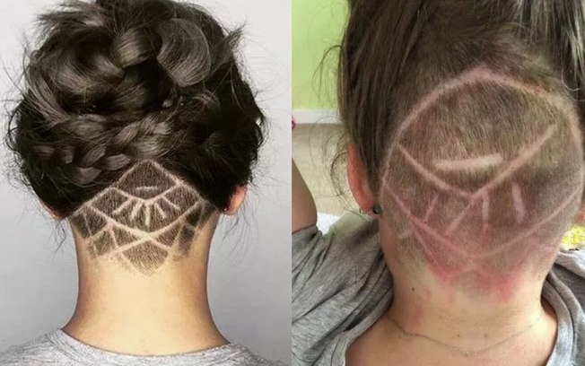 De tempos em tempos o corte undercut - no qual a parte de trás do cabelo, próximo à nuca, é raspada - volta a ser tendência. Mas é preciso confiar no trabalho do profissional que vai realizar o design nos fios, já que uma vez raspados, há pouco o que fazer se não gostar do resultado. E a britânica Lucy Burrows, da cidade de Swindon, no Sudoeste da Inglaterra, é notícia em diversos jornais internacionais depois de viver uma experiência nada agradável com o corte undercut . O resultado, como mostra a montagem de fotos acima, ficou muito diferente do esperado. Segundo informações do jornal "The Mirror", a britânica levou a foto da esquerda, uma reprodução de um perfil de Instagram, para que o cabeleireiro soubesse exatamente como ela queria os fios. A ideia era raspar e finalizar o corte com um desenho geométrico.