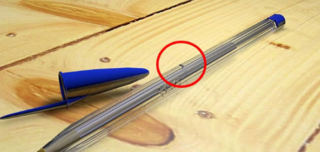 Um dos buraquinhos mais famosos são os da caneta BIC. Esse furo na verdade é pura física. Ele faz com que a pressão interna da caneta se iguale a pressão atmosférica, e é por isso que quando o buraco está tampado causa aquele estrago todo, fazendo com que a caneta estoure.