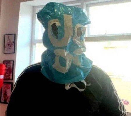 Um homem que não estava com máscara, em prevenção à Covid-19, teve improvisar um saco plástico com dois furos nos olhos para conseguir entrar em uma lanchonete em Plymouth na, Inglaterra, para comprar um sanduíche.