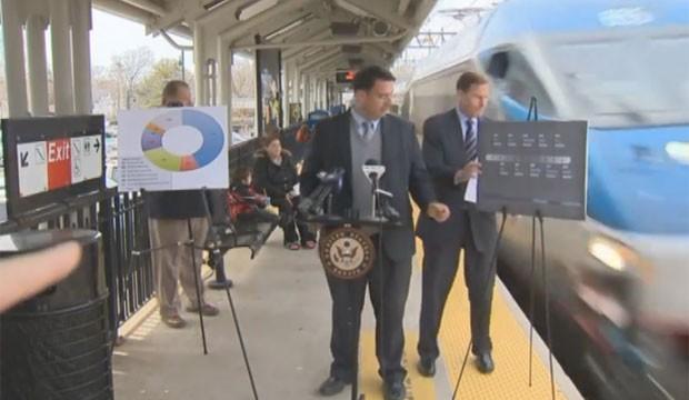 O senador democrata Richard Blumenthal levou um susto quando um trem de alta velocidade cruzou a poucos centímetros enquanto ele participava de uma coletiva de imprensa, ironicamente realizada para falar sobre a segurança ferroviária. Assista ao vídeo.