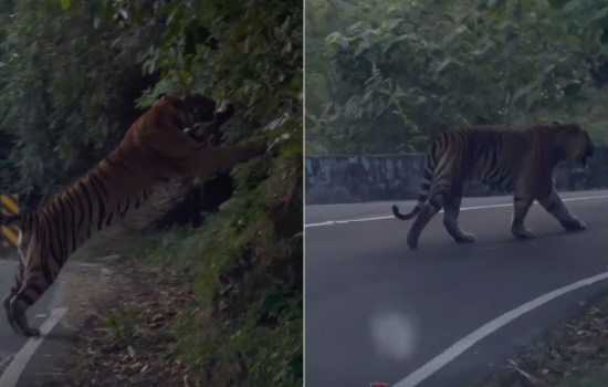Um tigre foi flagrado no meio de uma estrada que corta o estado de Tamil Nadu, na Índia. Um avistamente raro e impressionante, quando nos damos conta de que o enorme felino ocupa praticamente toda a pista enquanto caminha.