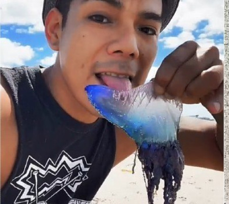 Depois, o tiktoker decide pegar a caravela-portuguesa, uma criatura marinha translúcida idêntica a várias águas-vivas, relata o tabloide The Irish Sun.