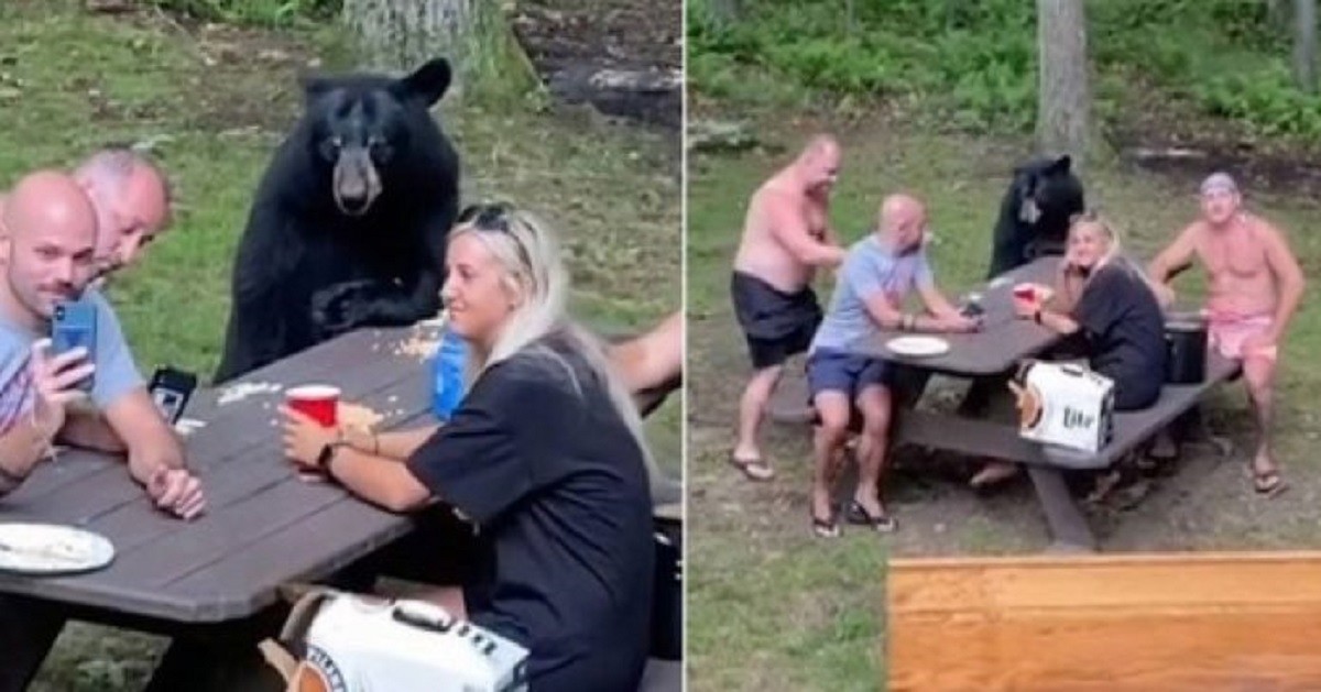 Só que, do nada, aparece um urso e, sem fazer cerimônia, senta à mesa com eles. E a naturalidade com que esses quatro amigos receberam o “convidado” torna a cena ainda mais inusitada!