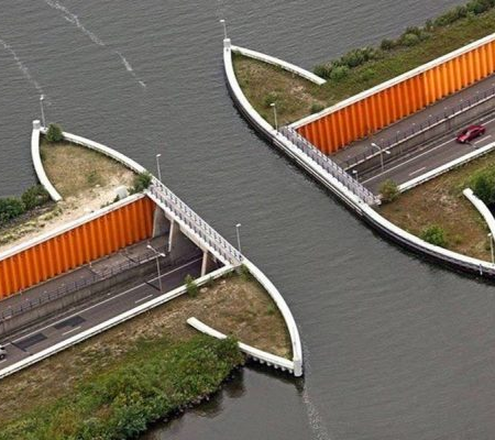 Inaugurado em 2002, o Aqueduto Veluwemeer é um impressionante trabalho de arquitetura e engenharia. Esta hidrovia mede 25 metros de comprimento por 19 metros de largura e está localizada em Harderwijk, no leste da Holanda. Durante o projeto desta passagem com características únicas, os engenheiros optaram por construir uma espécie de ponte onde passam até 28.000 veículos por dia. As informações são do Tricurioso.