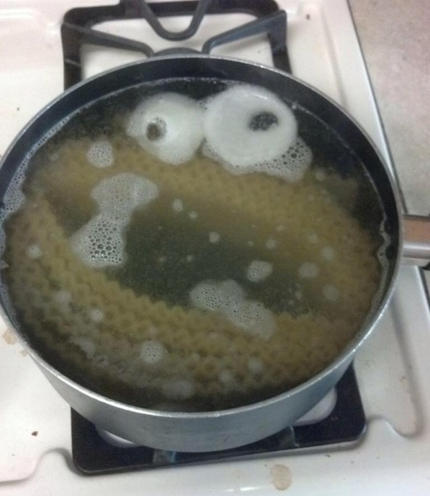 Ao cozinhar uma panela de macarrão, o usuário ?CaliG831? tirou uma foto curiosa em que ?flagra? o personagem ?Cookie Monster? (também conhecido como Come-Come) do programa infantil Vila Sésamo, como se estivesse dentro do recipiente. Com as bolhas na água, a espuma e os pedaços de macarrão, o conjunto lembra muito a aparência do personagem, que é conhecido por seu estilo bonachão e seu apetite feroz, principalmente por cookies.