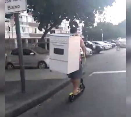 Em um vídeo publicado no Facebook pelo usuário Leandro Luiz Rozario, um homem aparece transportando um fogão em suas costas enquanto guia o patinete elétrico por Copacabana, Zona Sul da cidade.