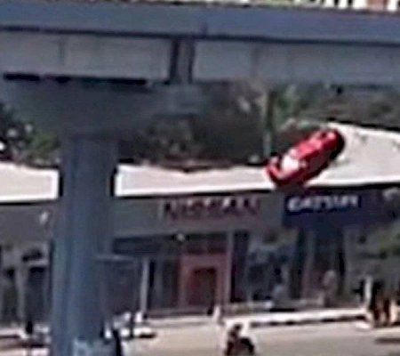 Vídeo mostra um carro caindo de viaduto e atinge pedestres; veja