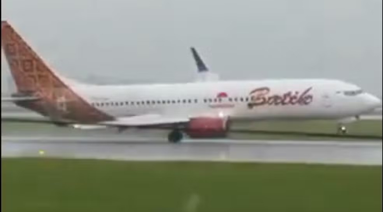Um vento forte quase próximo à pista fez um avião pousar "torto" em um aeroporto da Indonésia neste domingo (29).