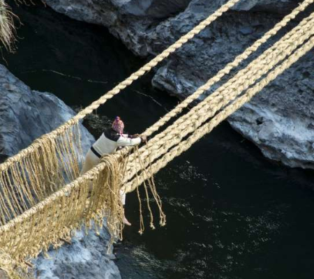 A ponte Q'eswachaka, feita de cordas tecidas à mão, existe há pelo menos 600 anos. Outrora parte da rede que ligava as cidades e vilas mais importantes do Império Inca, ela foi declarada Patrimônio da Humanidade pela Unesco em 2013.