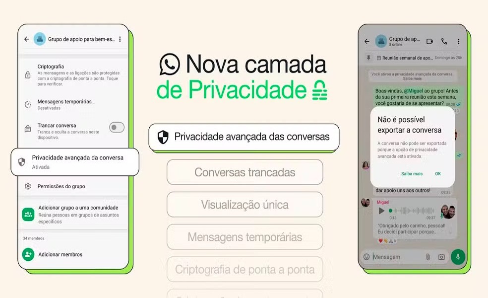 O recurso, chamado de Privacidade avançada da conversa, foi anunciado na quarta-feira (23) e está sendo disponibilizado aos poucos para os usuários.