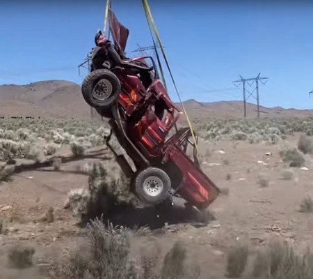 O quarto – é último – desafio foi o mais hollywoodiano. O canal contratou um helicóptero especial para erguer cargas pesadas (e que custou US$ 100 mil o minuto ou R$ 500 mil, segundo o canal) para jogar a picape de duas alturas diferentes. A cifra é um pouco duvidosa, mas tá valendo.