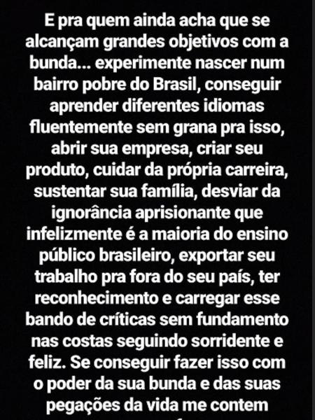 Depois de assumir um relacionamento ainda sem rótulo com Pedro Scooby, ex-marido de Luana Piovani, Anitta usou sua rede social sábado (01) para desabafar: "E para quem ainda acha que se alcançam grandes objetivos com a bunda... Experimente nascer num bairro pobre do Brasil, conseguir aprender diferentes idiomas fluentemente sem grana pra isso, abrir sua empresa, criar seu produto, cuidar da própria carreira, sustentar sua família, desviar da ignorância aprisionante que infelizmente é a maioria do ensino público brasileiro, exportar seu trabalho pra fora do seu país, ter reconhecimento e carregar esse bando de críticas sem fundamento nas costas seguindo sorridente e feliz. Se conseguir fazer isso com o poder da sua bunda e das suas pegações da vida me contem como, por favor".