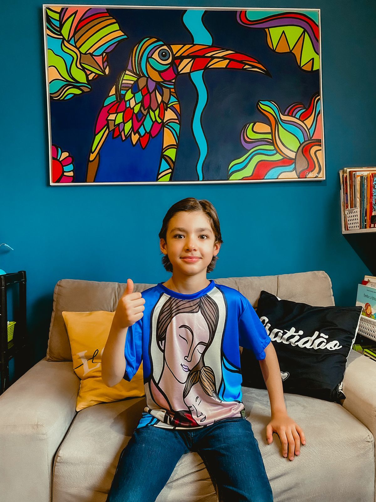 A mãe, diz que percebeu, logo que o filho começou a se interessar por arte, que ele “construía um conceito”, para além do que crianças costumam representar em desenhos. “Ele começou pintando os rostos em lápis no papel, então incentivei a pintar na tela. Cada vez que ele ia pintar se aperfeiçoava, a combinação de cores, o traço muito firme”, narra.