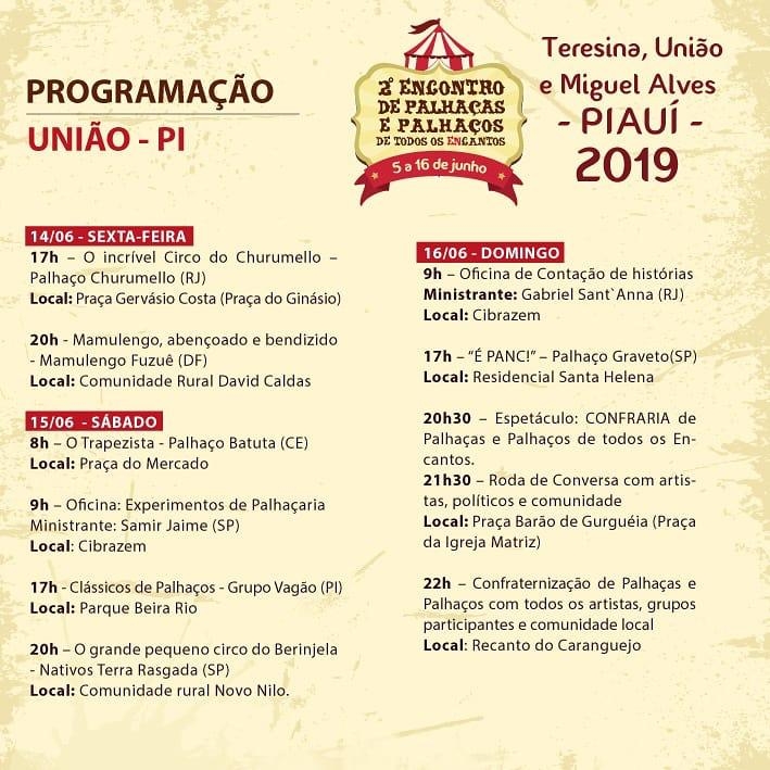 O mês de junho começa com muita alegria. De 5 a 16 acontece o 2º Encontro de Palhaças e Palhaços de Todos os Encantos. O evento irá percorrer as cidades de Teresina(de 5 a 9), Miguel Alves(de 10 a 13) e União(de 14 a 16).