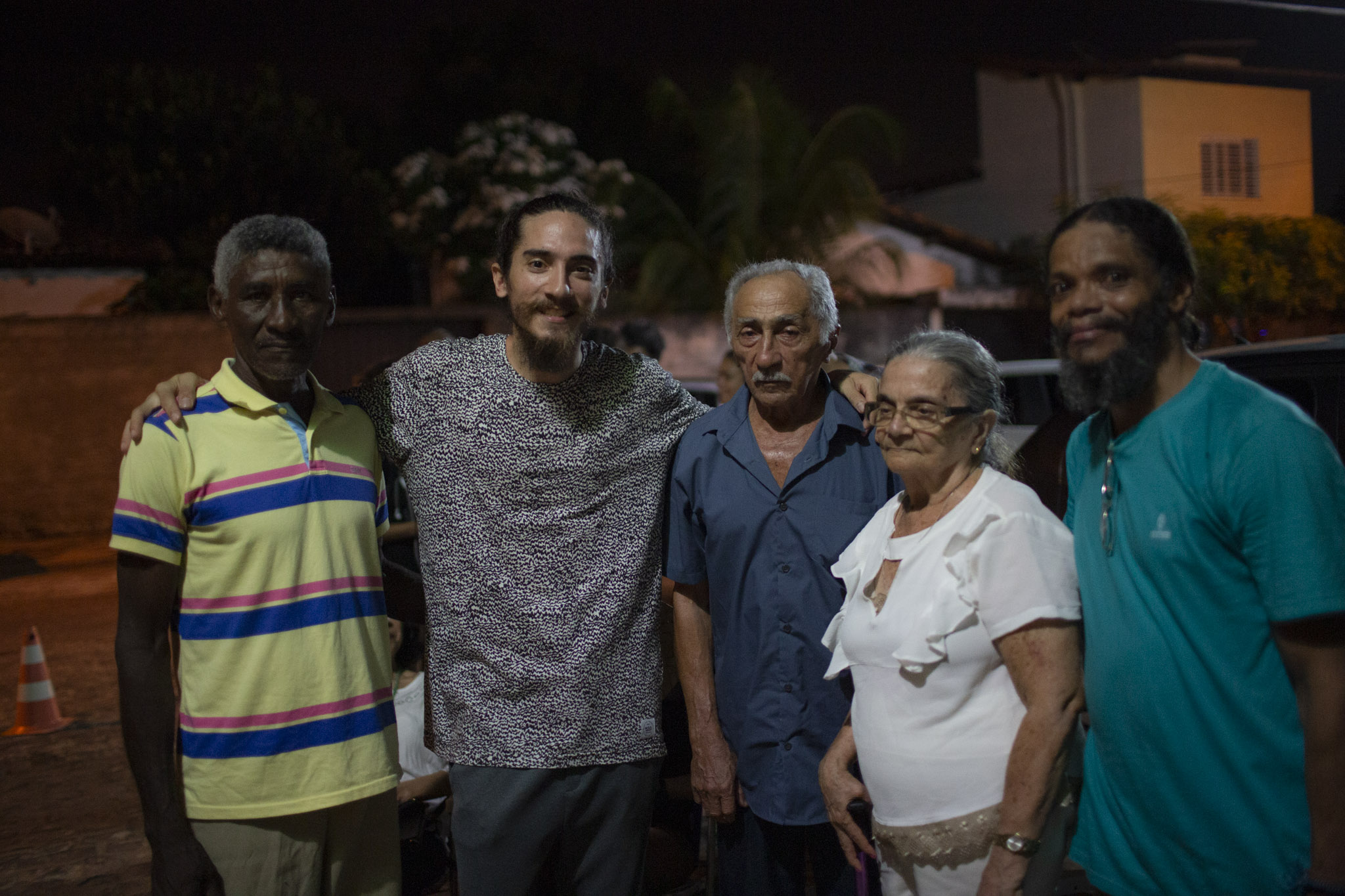 Maurício Pokemon ao lado dos moradores da Boa Esperança e familiares durante abertura da exposição / da esq. para dir.: Seu Valdir, Maurício, avós do artista e Chico)| Foto: Jairo Moura/Rumos Itaú