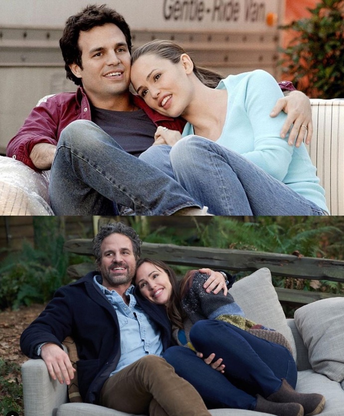 A atriz publicou a montagem, em seu perfil nas redes sociais, com a foto feita recentemente e a cena do filme. Na imagem, Jennifer, que deu vida à personagem Jenna Rink, aparece sentada ao lado do amigo Matt Flamhaff (Mark Ruffalo).