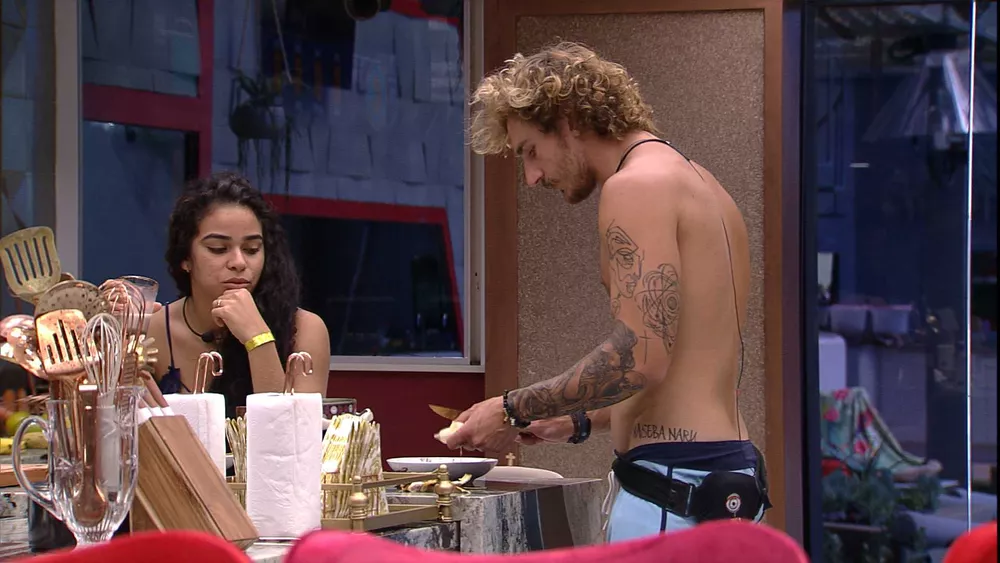Depois dos exercícios, Alan segue para preparar o café da manhã na cozinha. O brother decide fazer panquecas de banana e conta com a orientação de Elana.