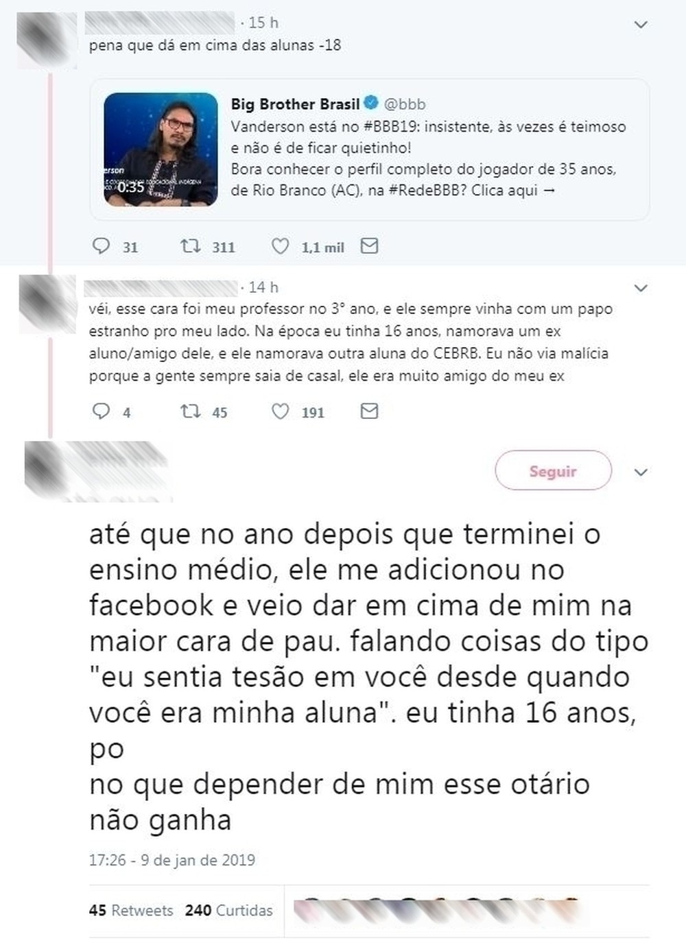 Vanderson falou também sobre as postagens em redes sociais de supostas alunas afirmando que foram assediadas pelo biólogo. Ele destacou que sempre tratou os alunos de forma igual e nunca houve problemas nas escolas onde lecionou.